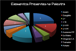 Estiveram presentes 21 pessoas, que se mostraram interessadas nos temas dissertados. Entre os presentes (ver gráfico 'Elementos Presentes na Palestra') destaca-se o Presidente e o Secretário de Direcção do Conselho de Arbitragem da Associação de Futebol de Coimbra, respectivamente, Sr. Apolino Pereira e Sr. José Ferreira Nunes. Deve-se referir, também, que a maioria dos árbitros dos quadros nacionais que representam o nosso distrito estiveram presentes: Nuno Roque (2.ª FPF); Rui Tavares (3.ª FPF); José Laranjeira (3.ª FPF); Fernando Matias Ferreira (3.ª FPF) e Nuno Pereira (Assistente 2.ª FPF).